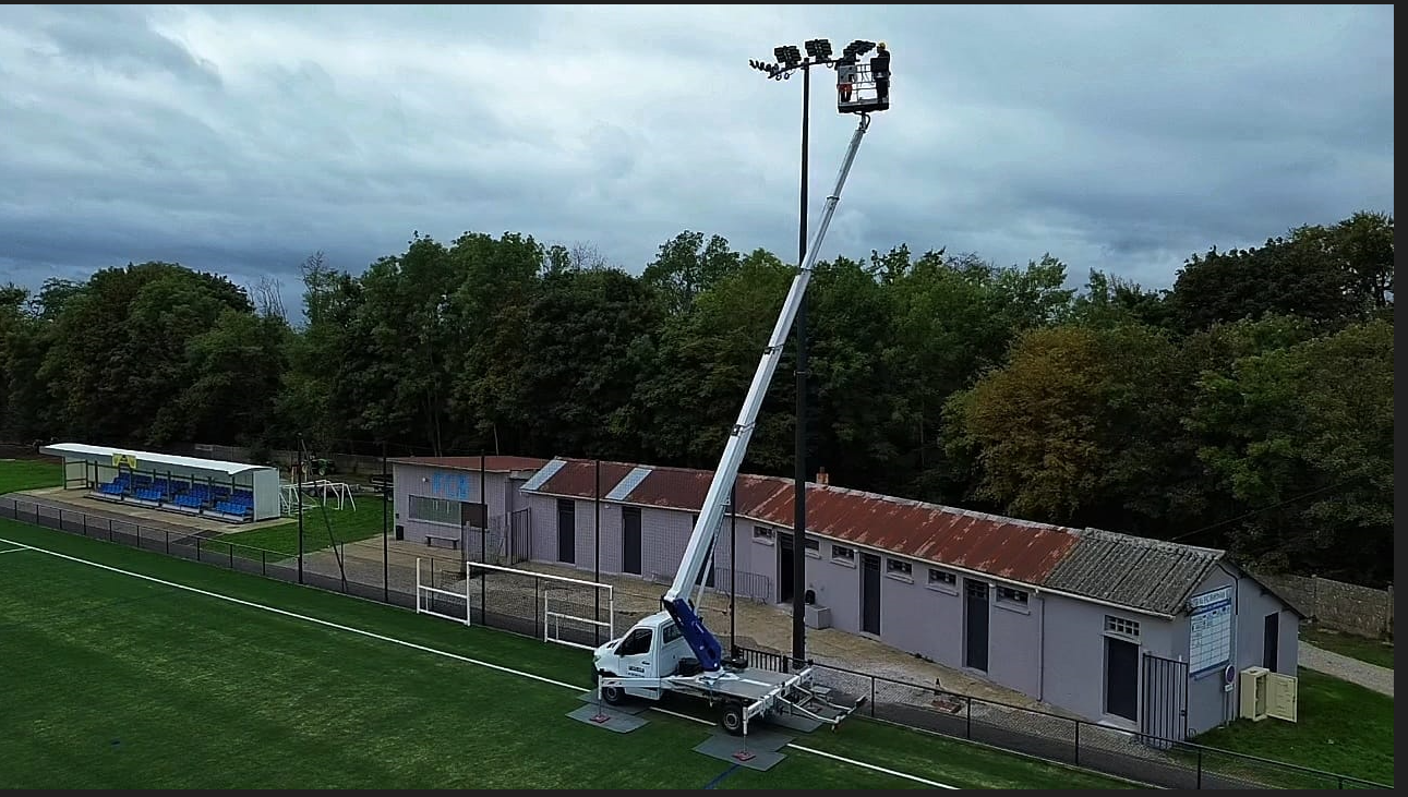 Pose de candélabres 20m par héliportage avec 5 projecteurs par mâts: STADE BETHISY SAINT PIERRE